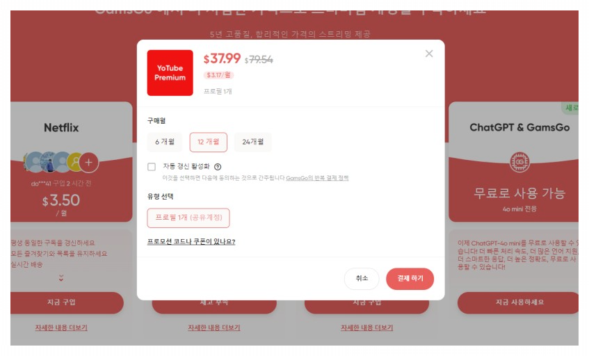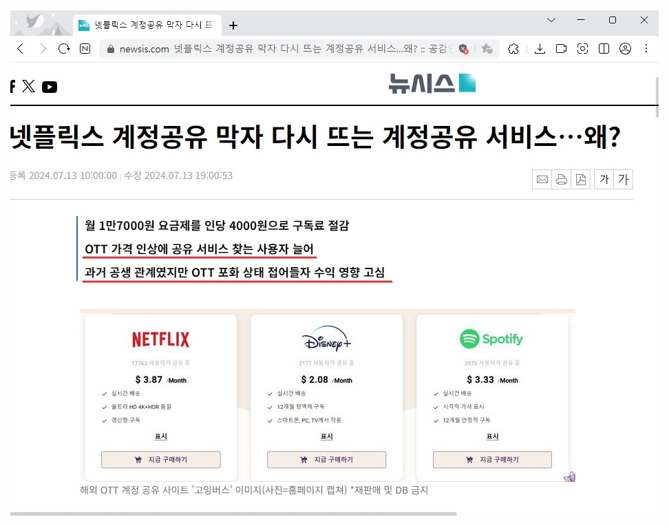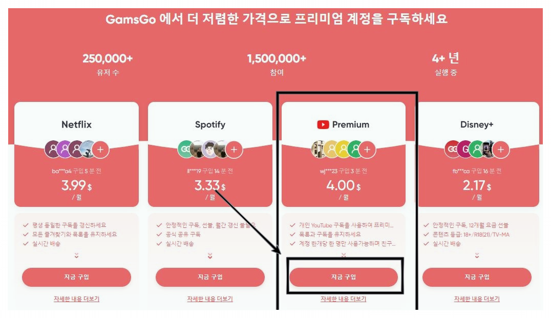 아래 버튼을 눌러 넷플릭스, 유튜브등 정가2만원에서 월4천원으로 저렴하게 이용해 보실 수 있습니다.
