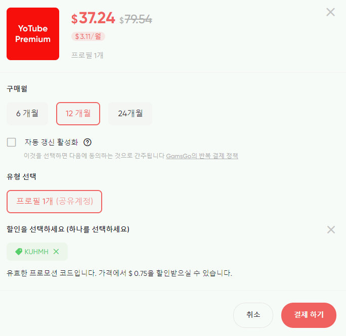 겜스고를 이용할 때 할인 코드를 활용하는 것이 중요합니다. 할인 코드인 'KUHMH'를 입력하면 추가적인 할인 혜택을 받을 수 있습니다. 이 코드는 가족이나 친구와 함께 재사용할 수 있어, 여러 명이 함께 이용할 경우 더욱 경제적입니다. 할인 코드를 통해 절약한 비용은 다른 OTT 서비스 이용에 활용할 수 있습니다.