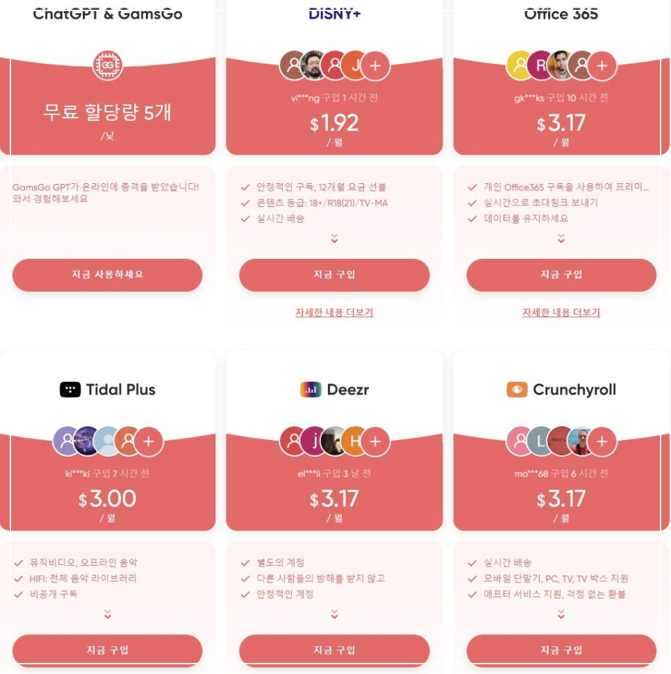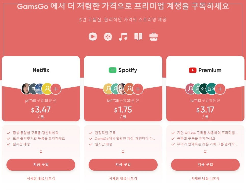겜스고는 디즈니플러스뿐만 아니라 넷플릭스, 유튜브 프리미엄, 스포티파이 등 다양한 OTT 서비스도 할인받아 이용할 수 있는 장점이 있습니다. 여러 서비스를 동시에 이용하고 싶다면 겜스고를 통해 비용을 절감할 수 있는 좋은 기회입니다. 각 서비스마다 제공하는 콘텐츠가 다르므로, 원하는 콘텐츠를 고려하여 선택하면 좋습니다.