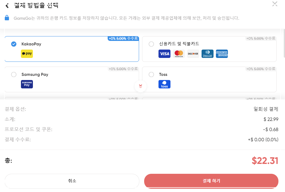 겜스고에서 결제를 진행할 때, 프로모션 코드 "KUHMH"를 입력하면 추가 할인을 받을 수 있습니다. 이 코드는 넷플릭스와 유튜브 프리미엄 등 다른 서비스에도 적용되며, 최대 5%까지 할인 혜택을 제공합니다. 결제 방법도 다양하므로, 본인에게 편리한 방법을 선택하면 됩니다. 카카오페이 등 여러 간편 결제 수단이 지원되니, 사용자의 편의에 맞게 선택하면 좋습니다.