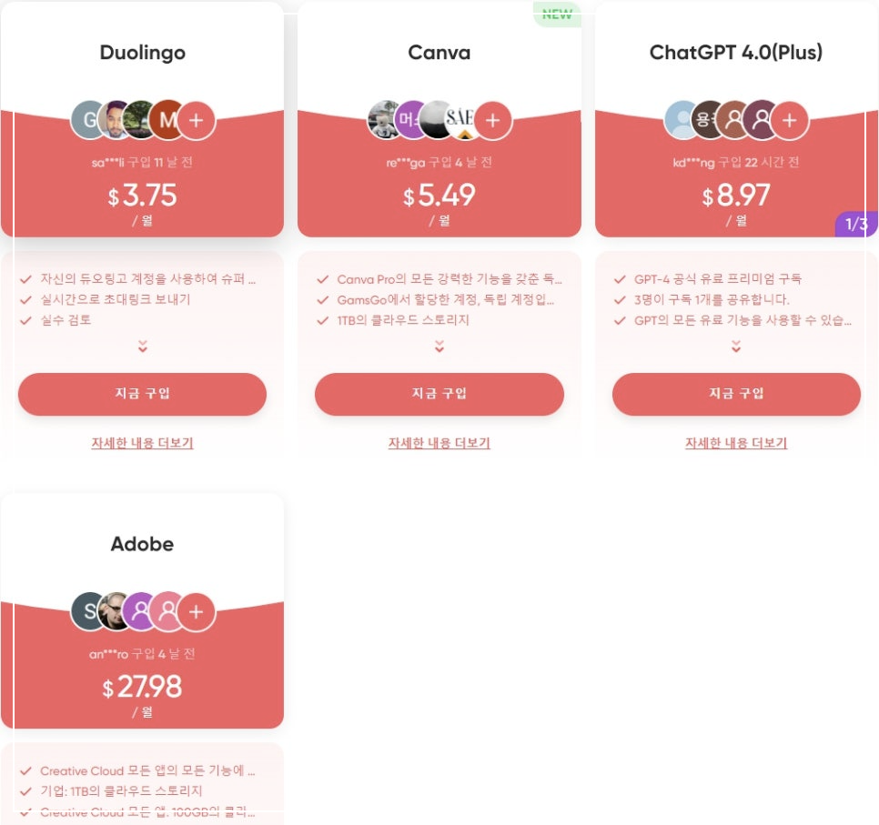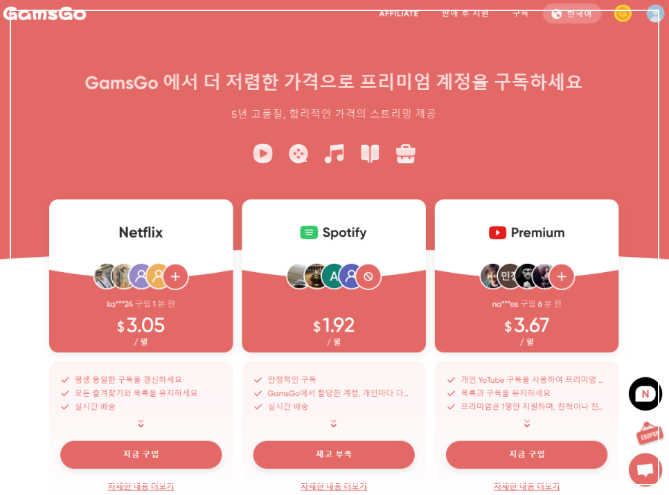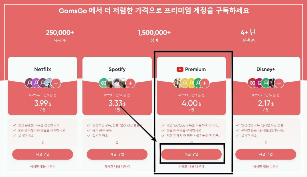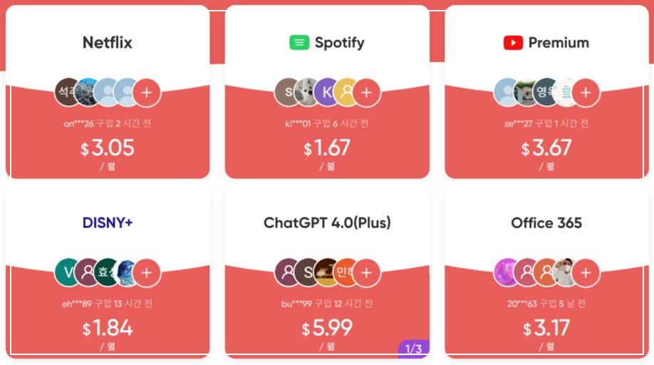 아래 버튼을 눌러 넷플릭스, 유튜브등 정가2만원에서 월4천원으로 저렴하게 이용해 보실 수 있습니다.