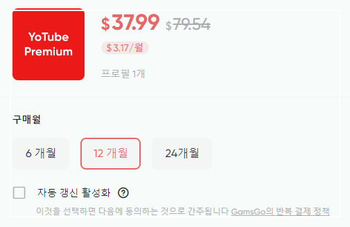 구매 시 할인코드 입력 항목이 있으며, [KUHMH]를 입력하면 넷플릭스와 유튜브는 5%, 그 외에는 3% 추가 할인을 받을 수 있습니다.