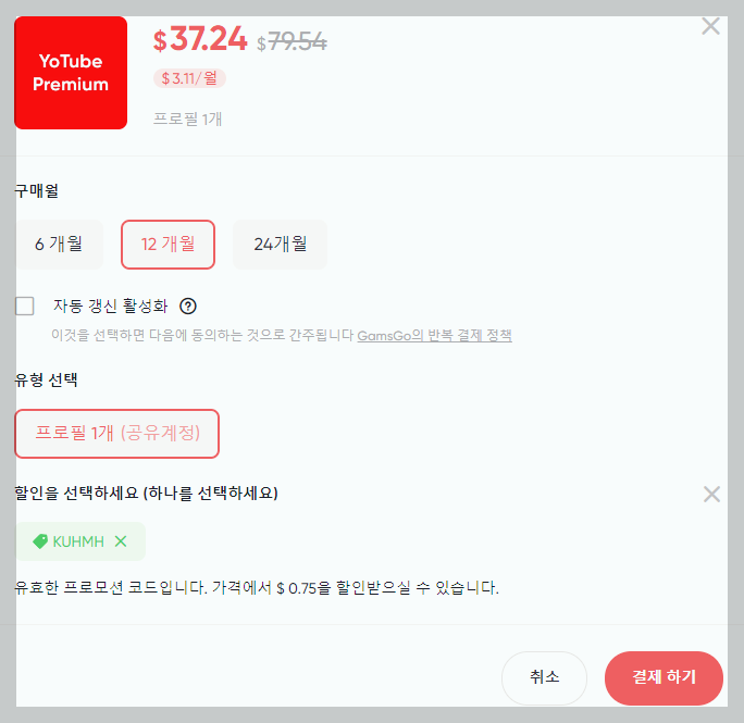 구매 시 할인코드 입력 항목이 있으며, [KUHMH]를 입력하면 넷플릭스와 유튜브는 5%, 그 외에는 3% 추가 할인을 받을 수 있습니다.