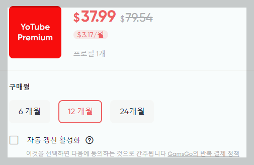 겜스고에서는 1개월, 3개월, 6개월, 12개월 등 다양한 요금제를 선택할 수 있습니다. 프리미엄 요금제를 기준으로 할 경우, 매월 3.87달러로 이용할 수 있습니다. 이는 연간 이용권을 선택할 때 더욱 할인된 가격으로 제공되며, 12개월 이용 시 총 37.77달러로 책정됩니다. 원화로 환산하면 약 52,136원으로, 한 달에 약 4,400원에 이용할 수 있습니다.