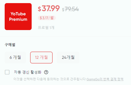 유튜브 프리미엄을 기준으로 겜스고의 공유 요금제와 비교해 보겠습니다. 겜스고에서는 유튜브 프리미엄을 6개월, 12개월, 24개월 단위로 결제할 수 있습니다. 특히 12개월 기준으로 보면, 유튜브 프리미엄의 공식 요금은 178,000원이지만, 겜스고에서는 52,600원에 이용할 수 있습니다.