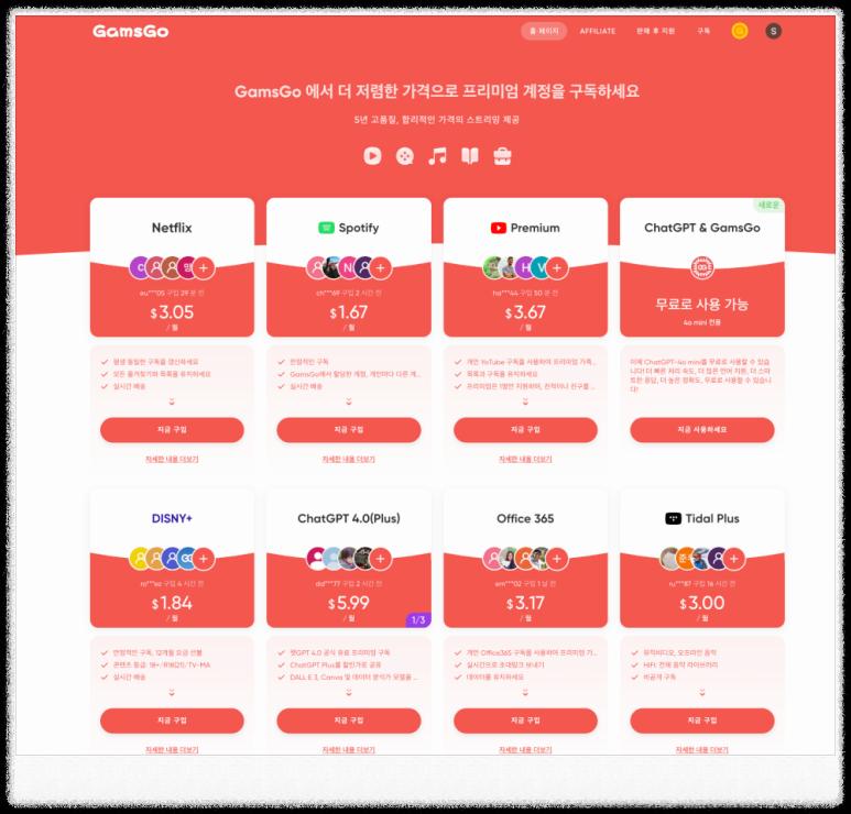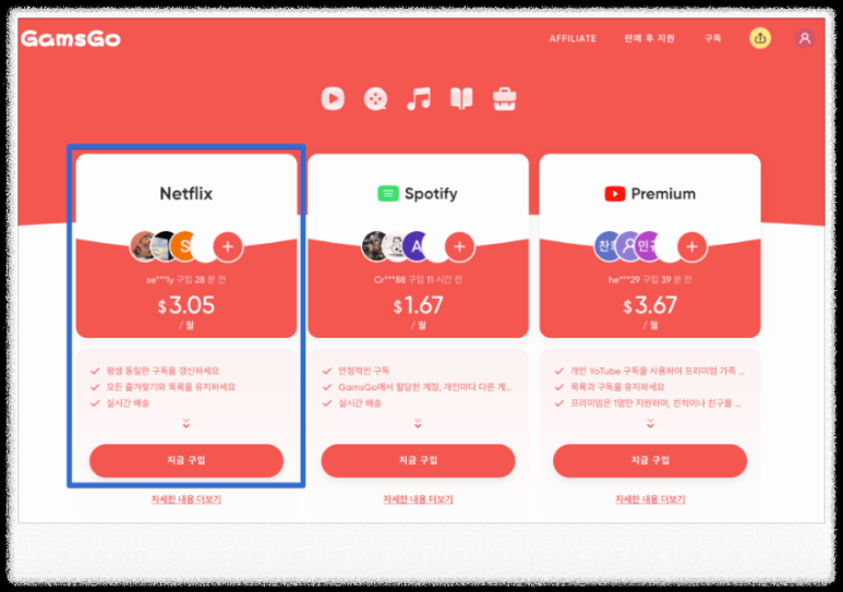 아래 버튼을 눌러 넷플릭스, 유튜브등 정가2만원에서 월4천원으로 저렴하게 이용해 보실 수 있습니다.