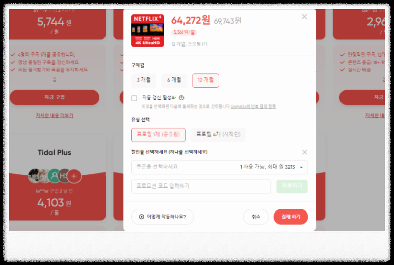 구매 시 할인코드 입력 항목이 있으며, [KUHMH]를 입력하면 넷플릭스와 유튜브는 5%, 그 외에는 3% 추가 할인을 받을 수 있습니다. 최대 7천5백 원대로 저렴해지니 꼭 입력해 보세요~