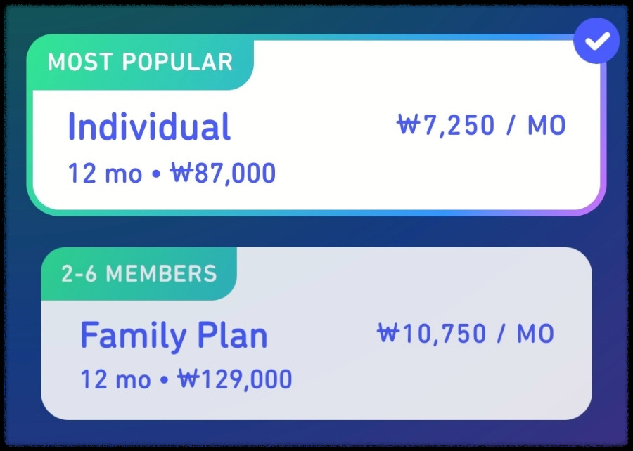 듀오링고는 두 가지 요금제를 제공합니다. 첫 번째는 슈퍼 듀오링고로, 혼자 사용하는 요금제로 한 달에 14,000원, 연간 87,000원입니다. 두 번째는 패밀리 듀오링고로, 2~6인이 함께 사용하는 요금제로 동일하게 한 달에 14,000원, 연간 129,000원입니다.