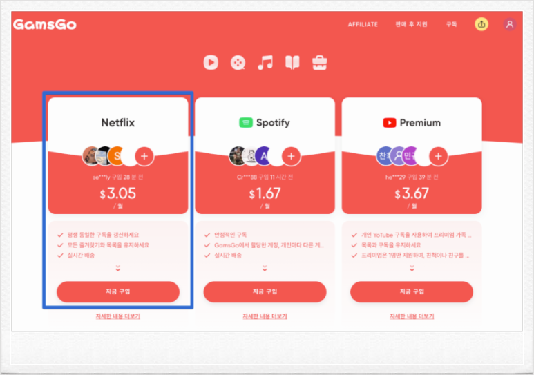 구매 시 할인코드 입력 항목이 있으며, [KUHMH]를 입력하면 넷플릭스와 유튜브는 5%, 그 외에는 3% 추가 할인을 받을 수 있습니다.