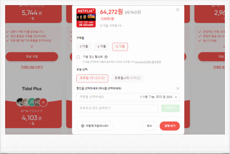 구매 시 할인코드 입력 항목이 있으며, [KUHMH]를 입력하면 넷플릭스와 유튜브는 5%, 그 외에는 3% 추가 할인을 받을 수 있습니다. 최대 7천5백 원대로 저렴해지니 꼭 입력해 보세요~