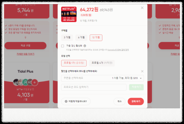 구매 시 할인코드 입력 항목이 있으며, [KUHMH]를 입력하면 넷플릭스와 유튜브는 5%, 그 외에는 3% 추가 할인을 받을 수 있습니다. 최대 7천5백 원대로 저렴해지니 꼭 입력해 보세요~
