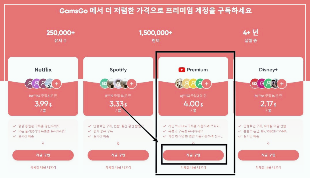 A: 네, 유튜브 프리미엄을 저렴하게 이용하는 방법 중 하나는 **겜스고(GamsGo)**라는 공유 플랫폼을 이용하는 것입니다. 겜스고는 유튜브 프리미엄을 포함한 여러 구독 서비스를 저렴한 가격에 제공하는 플랫폼으로, 광고 없는 동영상 시청, 백그라운드 재생, 오프라인 시청 등 유튜브 프리미엄의 모든 기능을 공식 가격보다 훨씬 저렴하게 이용할 수 있습니다.