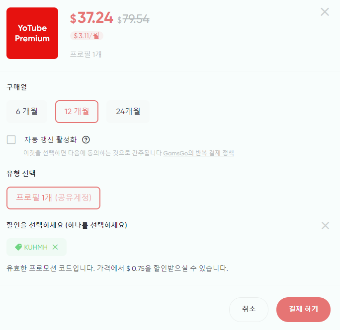 이렇게 간편한 절차를 통해 저렴하게 유튜브 프리미엄을 구독할 수 있습니다.