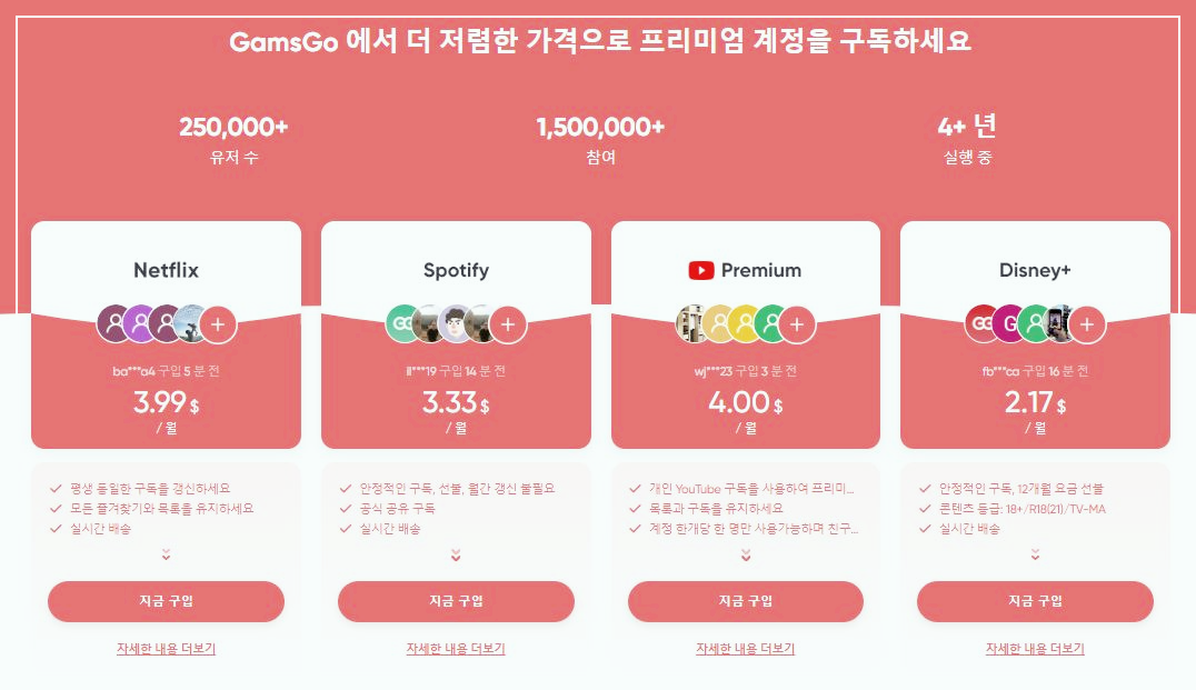 이 플랫폼은 서비스 이용을 위해 가족 계정 공유 방식을 사용하여 여러 사용자가 동일한 계정을 통해 서비스를 이용할 수 있게 해 줍니다. 이로 인해 개별 구독료보다 훨씬 저렴한 가격으로 서비스를 이용할 수 있습니다. 특히 겜스고는 단순히 OTT 서비스뿐만 아니라, 디자인 툴이나 오피스 소프트웨어 등 비즈니스와 개인 모두가 유용하게 사용할 수 있는 여러 서비스도 제공합니다.