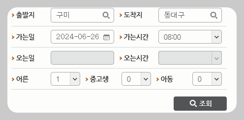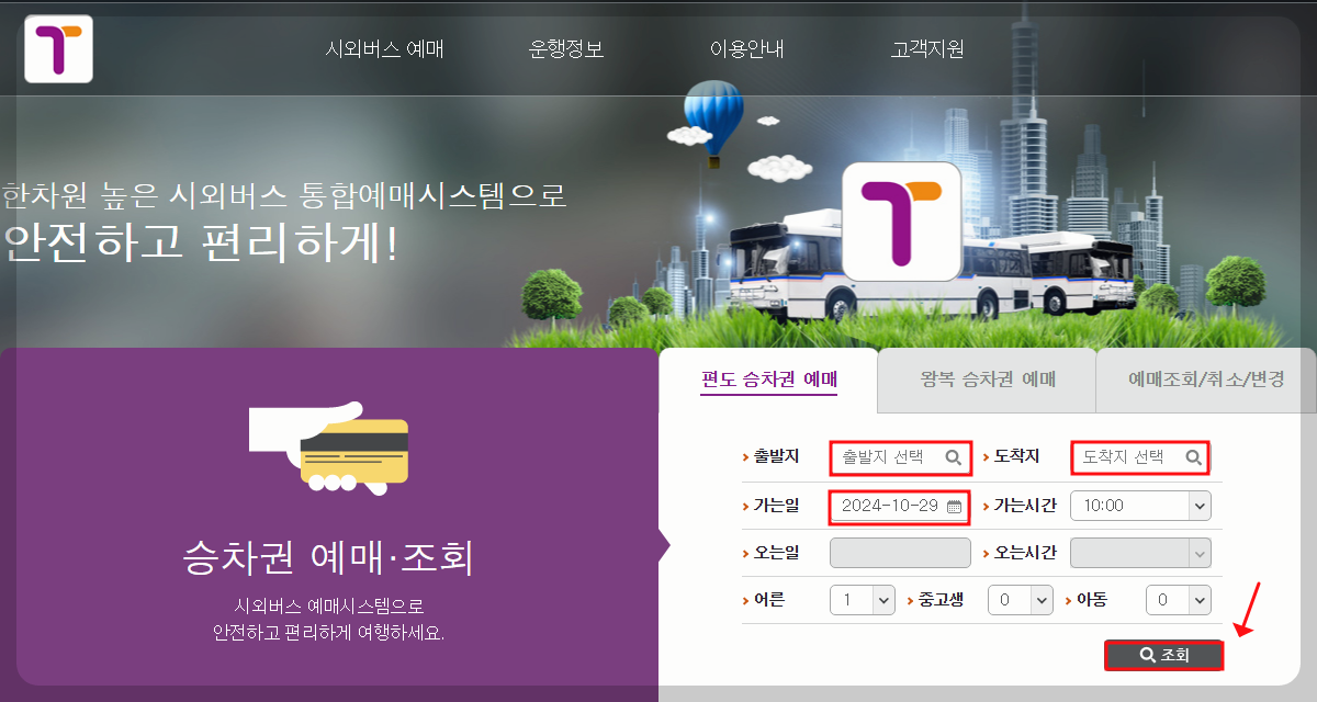 2️⃣ 홈페이지에서 출발지와 도착지를 선택한 후, 여행 날짜, 출발 시간, 탑승 인원을 입력하고 조회 버튼을 눌러 주세요.