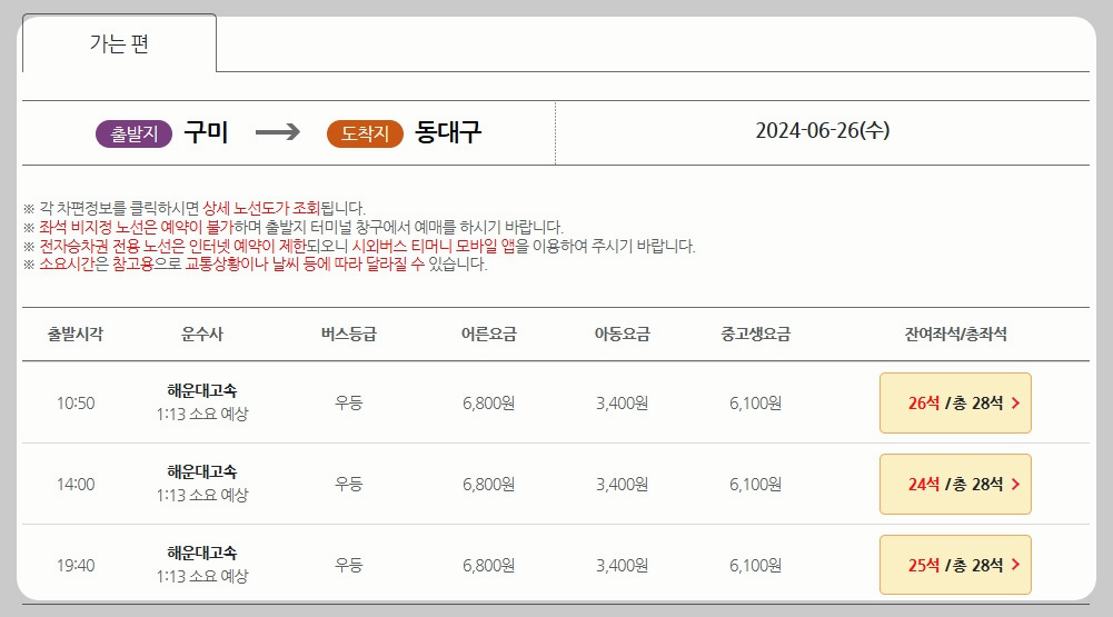 3️⃣ 이후, 선택하신 조건에 맞는 시간표와 남은 좌석 수, 요금을 실시간으로 확인하실 수 있습니다.