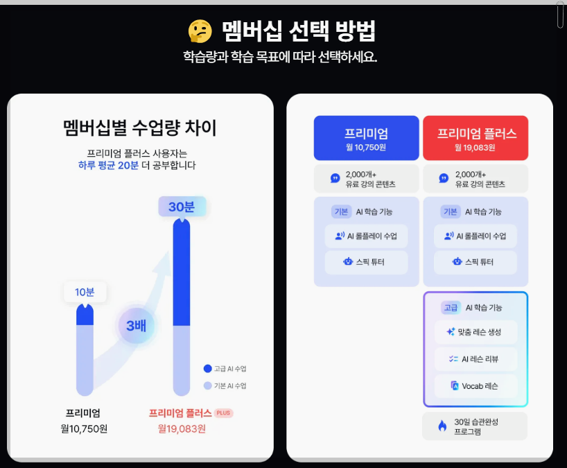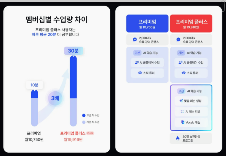 스픽은 20분 이내에 학습할 수 있도록 설계되어 있어 바쁜 일상 속에서도 쉽게 시간을 내어 학습할 수 있습니다. 가격도 합리적이며, 월 10,750원 또는 연간 129,000원으로 구독할 수 있습니다. 프리미엄 옵션을 선택하면 더 많은 기능을 이용할 수 있으며, 이는 영어 실력을 더욱 빠르게 향상시키는 데 도움을 줄 것입니다.