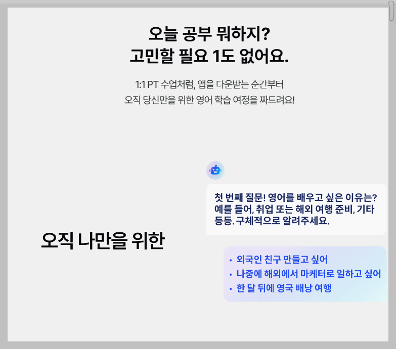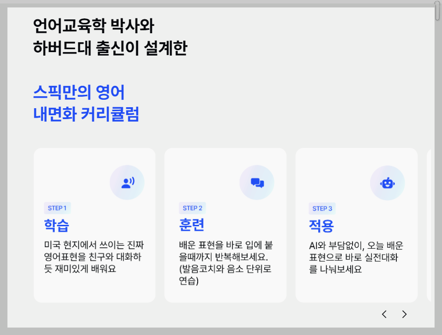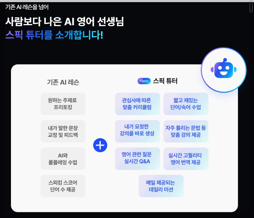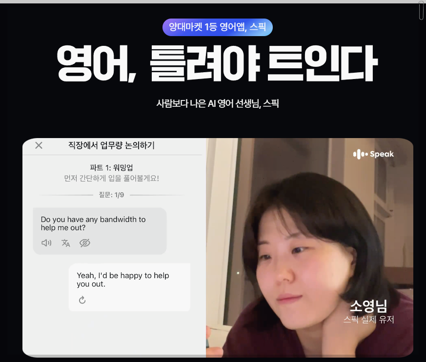 스픽은 왕초보부터 고급 단계까지 다양한 수준의 학습이 가능합니다. 이 어플의 가장 큰 장점은 AI 튜터와의 프리토킹 기능으로, 대화 후 문법적으로 틀린 부분을 교정해 줍니다. 이를 통해 사용자들은 실시간으로 피드백을 받을 수 있어, 보다 효과적으로 영어 실력을 향상시킬 수 있습니다. 또한, 다양한 주제로 학습할 수 있어 여행, 비즈니스 영어 등 필요에 맞춘 학습이 가능합니다.
