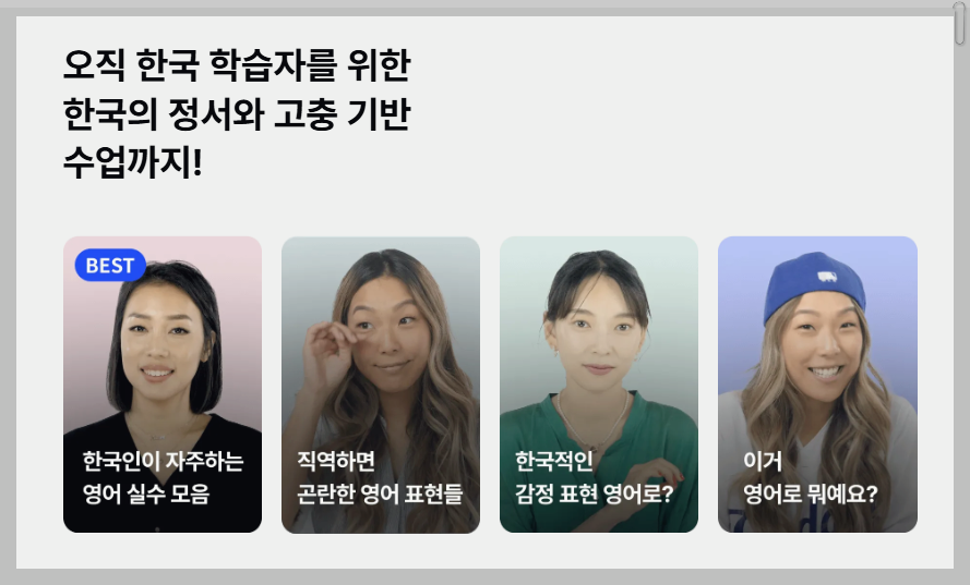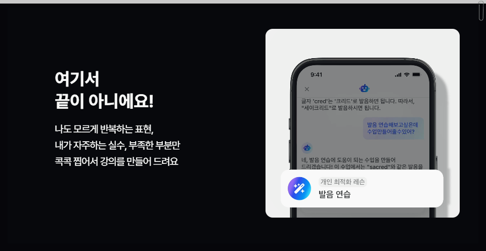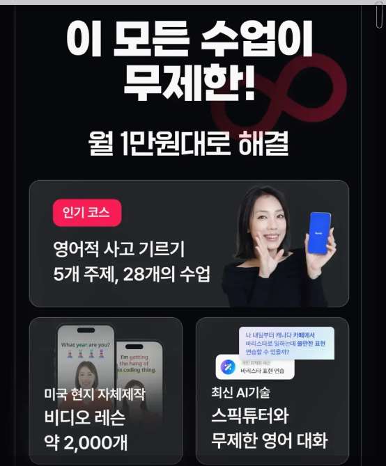케이크는 영상 기반의 학습을 제공하여, 핵심 패턴을 반복적으로 학습할 수 있는 장점이 있습니다. 이 어플은 짧은 영상으로 구성되어 있어, 지루하지 않고 재미있게 공부할 수 있습니다. 유료 가입 전에도 학습할 수 있는 영상들이 많아, 처음 사용해보는 사람들도 부담 없이 시작할 수 있습니다. 유료 가입 후에는 원어민 선생님과의 수업을 통해 더욱 심화된 학습이 가능합니다.