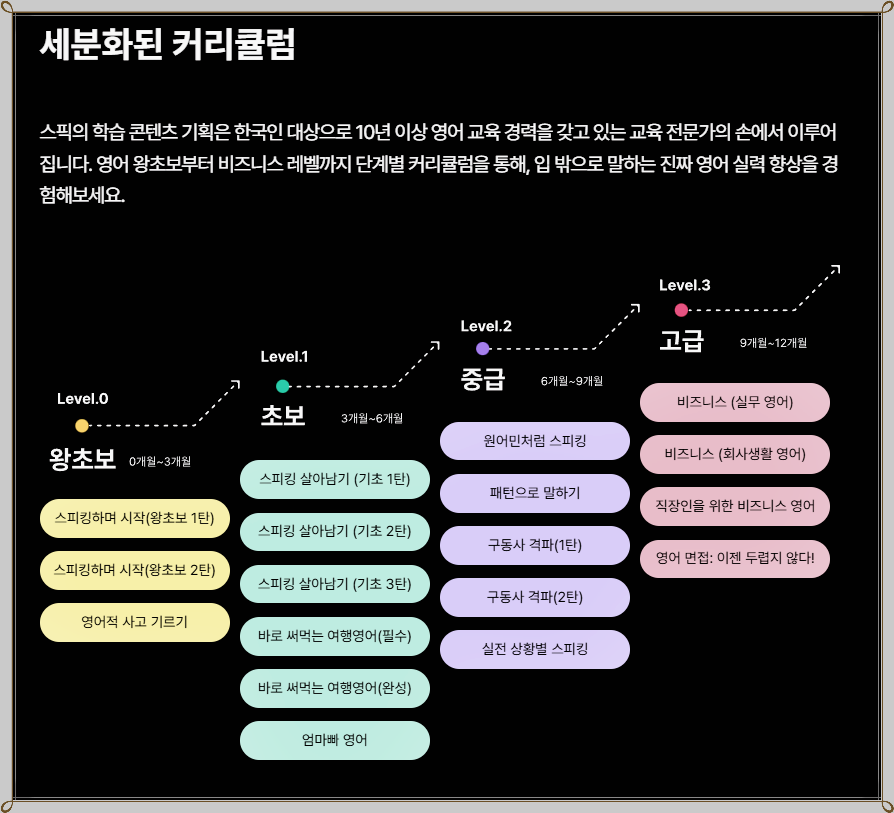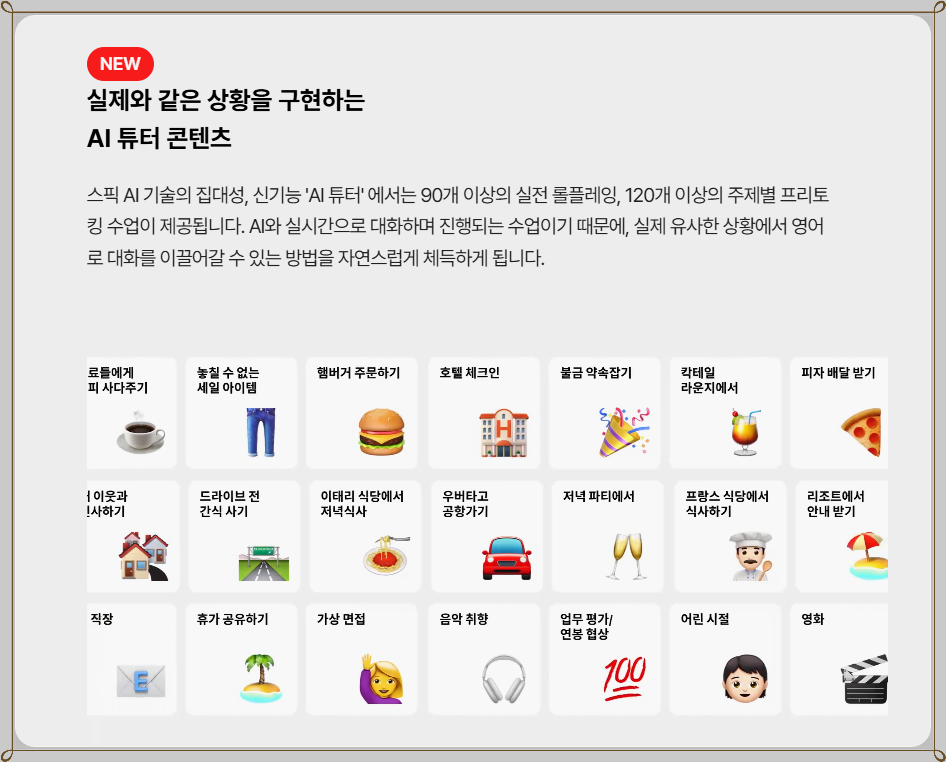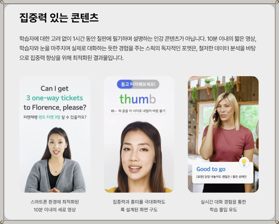 ✅ 스픽 프리미엄의 가장 큰 장점은 시공간의 제약 없이 자유롭게 영어를 학습할 수 있다는 점입니다. 직장인들은 점심 시간이나 출퇴근 시간 등을 활용하여 짧게라도 공부할 수 있고, 이는 바쁜 일상 속에서도 꾸준히 영어를 습득하게 하는 데 큰 도움이 됩니다. 또한, 다양한 학습 콘텐츠가 제공되어 지루하지 않게 공부할 수 있습니다.