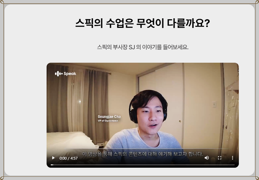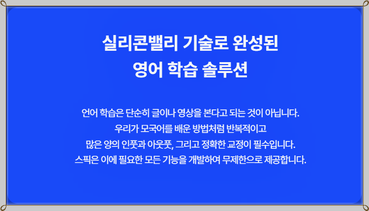 ✅ 스픽을 사용하면서 가장 인상 깊었던 점은 언제 어디서든지 학습 가능하다는 점이었습니다. 짧은 시간임에도 불구하고, 집중하여 영어를 연습할 수 있는 기회를 제공받았습니다. 그 덕분에 바쁜 회사 생활 중에도 더욱 효율적으로 시간을 활용하게 되었고, 자연스럽게 영어에 대한 두려움을 극복하게 되었습니다.