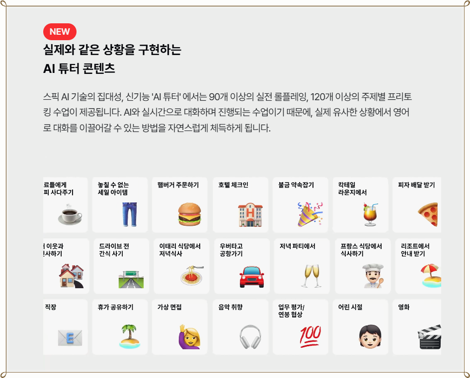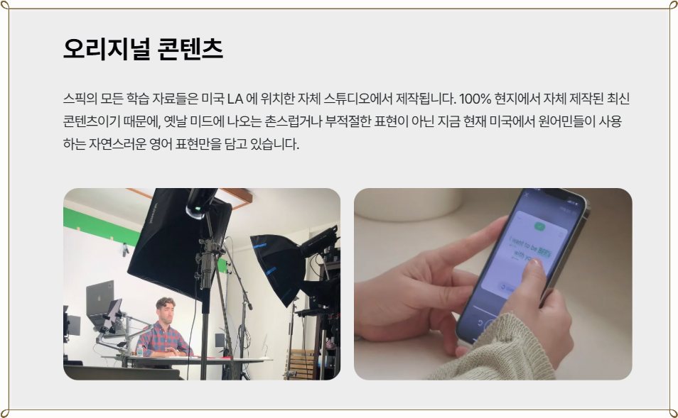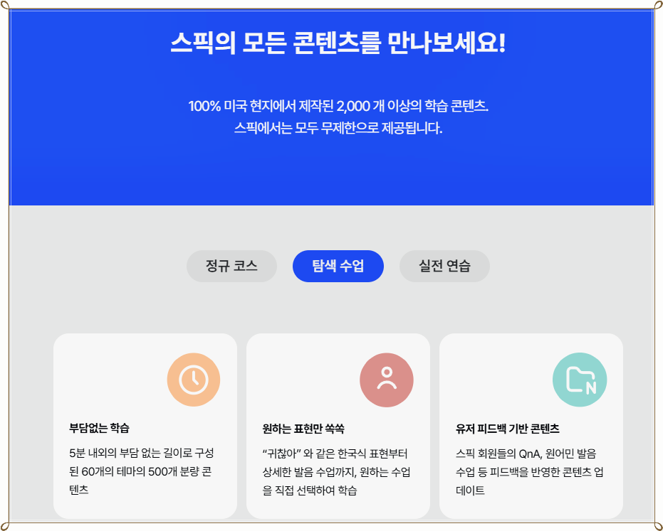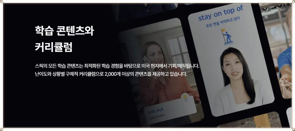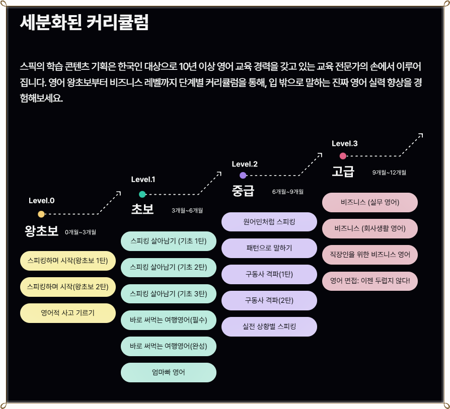 ✅ 스픽의 수업 방식은 크게 두 가지로 나뉩니다. 첫 번째는 사람이 직접 촬영한 콘텐츠이며, 두 번째는 AI 기반 콘텐츠입니다. 스픽의 정규 수업은 일반적으로 네 단계로 이루어져 있습니다. 각 단계에서는 다양한 방식으로 학습이 이루어지며, 이러한 구조 덕분에 보다 체계적으로 영어회화를 배울 수 있습니다.