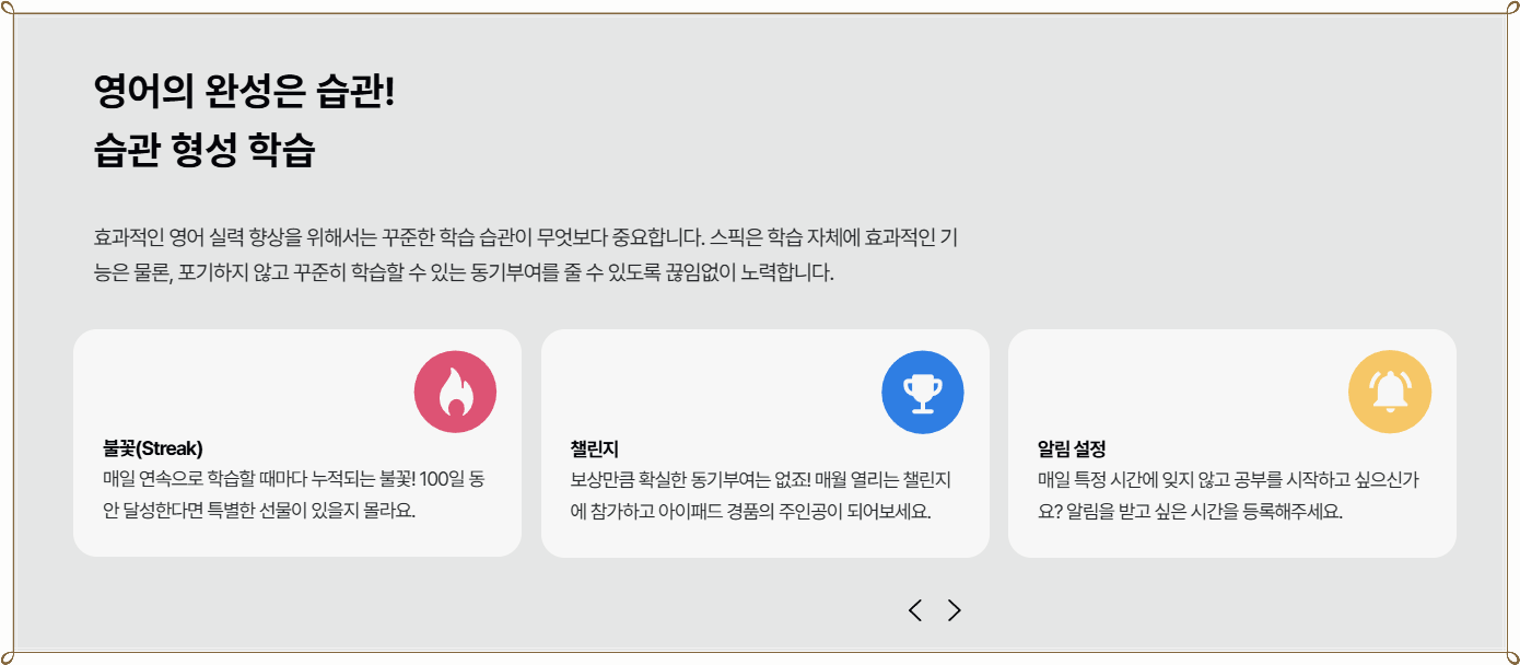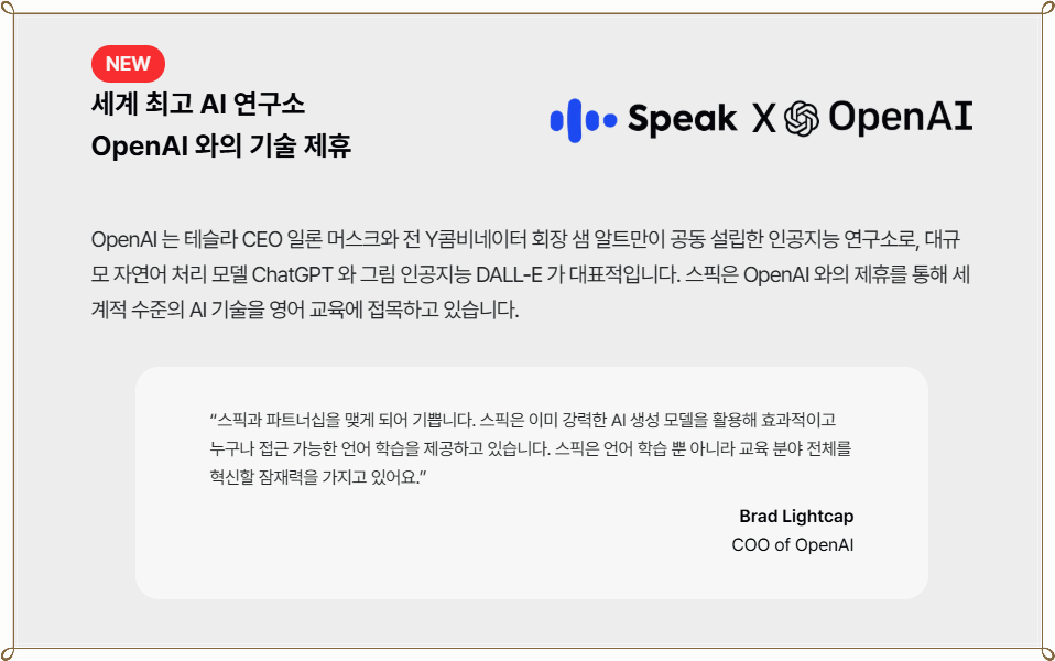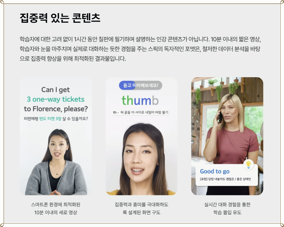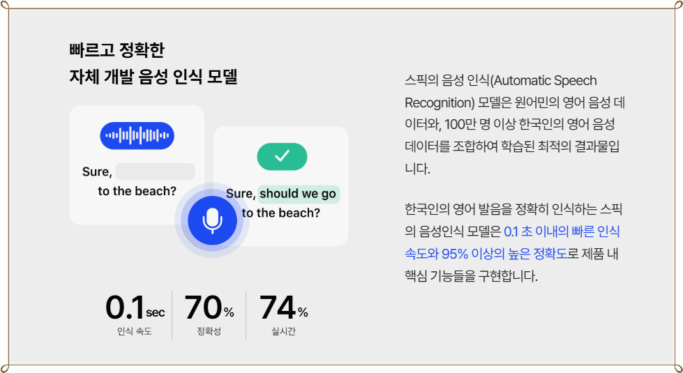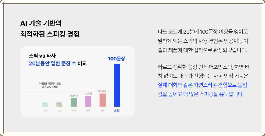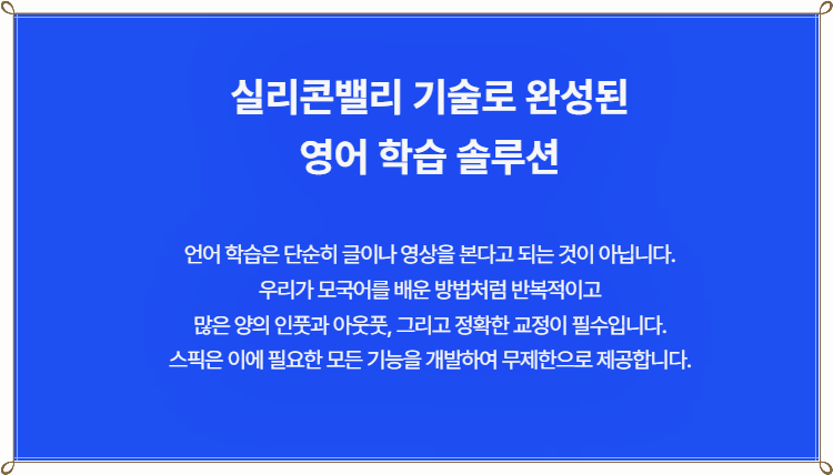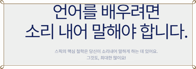 단순히 책으로 배우는 것만으로는 부족하며, 실제로 많이 말을 해봐야 한다고 강조했습니다. 이로 인해 영어는 학습하는 난이도보다 실습이 중요함을 깨닫게 된 것이죠. 따라서 스픽은 실제 대화를 통해서 자연스럽게 영어를 익히는 방식으로 개발되었습니다.