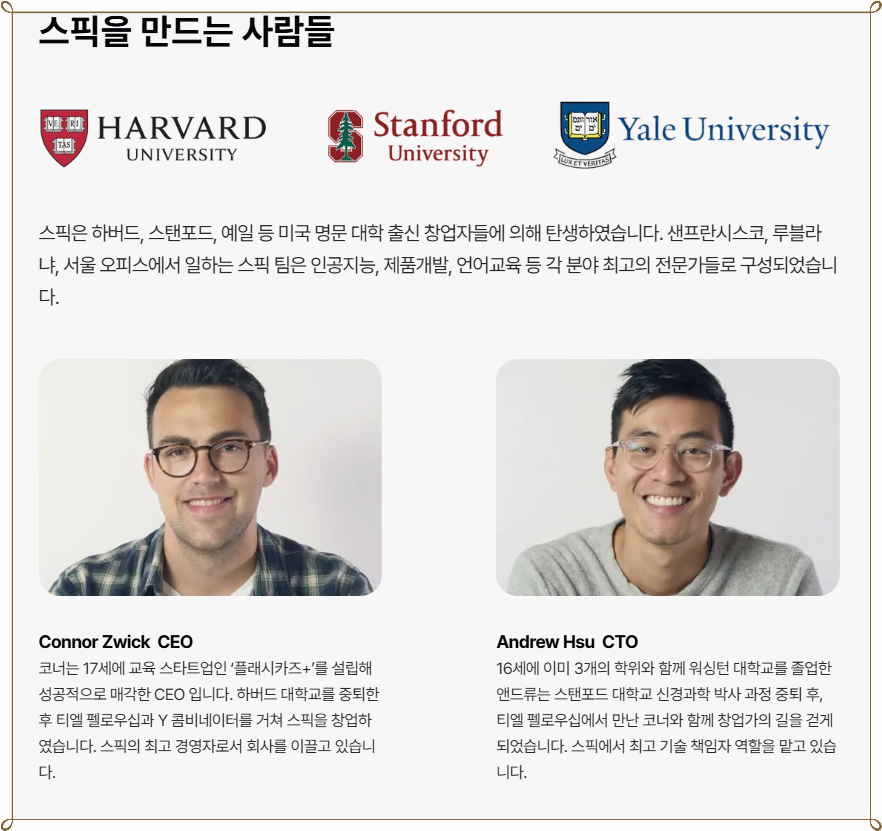 ✅ 스픽은 실리콘밸리에서 시작된 어플리케이션입니다. 이 앱의 창립자인 코너 즈윅은 고등학생 때부터 영어 교육 앱인 Flashcard+를 제작하여 앱스토어 1위를 기록한 경험이 있습니다. 이후 하버드대학교를 중퇴하고 스타트업에 뛰어들어 스픽을 개발하게 되었습니다. 그는 기존의 영어 학습 방식에 의문을 품었고, 영어를 배우는 방식이 피아노를 배우는 것과 유사하다고 생각했습니다.