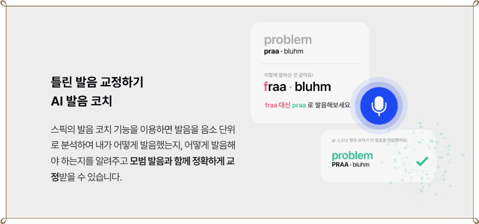스픽은 영어회화 학습에 필요할 수 있는 다양한 역할을 지원해 줍니다. 문법과 어휘 학습을 원하신다면, 서브로 활용하는 것도 좋은 방법일 수 있습니다. 다양한 상황에서 영어를 잘 구사할 수 있도록 돕는 스픽으로 언어 능력을 한 단계 끌어올려 보세요.