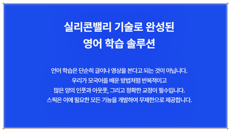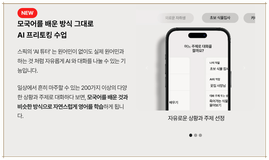 ✅ 제가 스픽을 선택한 이유는 첫 번째로 혁신적인 AI 시스템 때문이었습니다. 영어 실력을 향상시키기 위해 꾸준한 연습이 필수적인데, 스픽은 24시간 언제든지 AI와 대화할 수 있는 장점을 가지고 있습니다. 이러한 접근은 저에게 큰 매력이었습니다. 학원을 다니는 경우, 정해진 시간안에 수업을 듣고 또 다른 긴밀한 연습 시간을 갖는 것이 쉽지 않기 때문에 스픽의 이렇게 유연한 접근이 큰 강점으로 다가왔습니다.