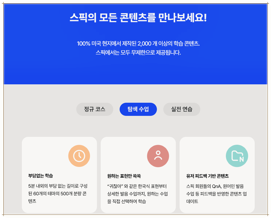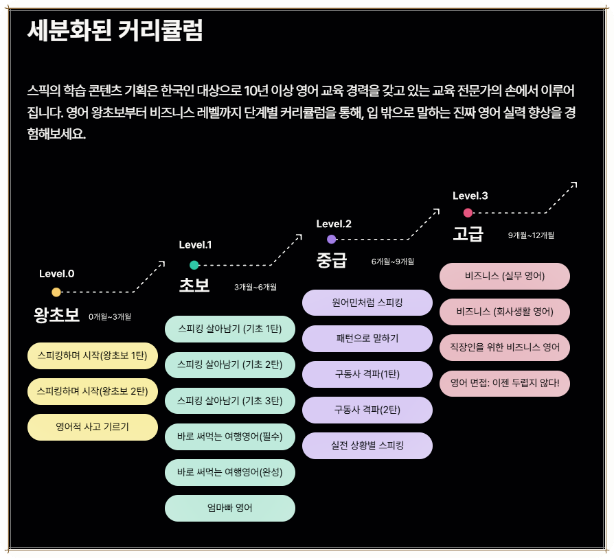 또한, 스픽은 사용자 맞춤형 학습이 가능합니다. 영어를 사용하는 목적이나 개인의 레벨에 따라 다양한 수업을 선택할 수 있어 매우 유용했습니다. 저는 특히 기초부터 다시 시작하자는 마음으로 왕초보 2탄을 선택했는데, 새로운 표현을 배우는 동시에 기존의 오류도 바로잡을 수 있어 정말 좋았습니다.