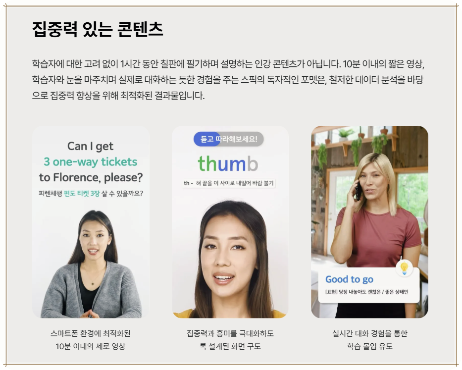 결국 이런 다양한 표현의 습득은 영어 회화 기본기 마련에 큰 도움이 되었습니다. 초급자도 유용하고, 심화 학습을 원하는 고급 사용자에게도 괜찮은 세분화된 수업이 제공된다는 점에서 소중한 경험이었습니다.