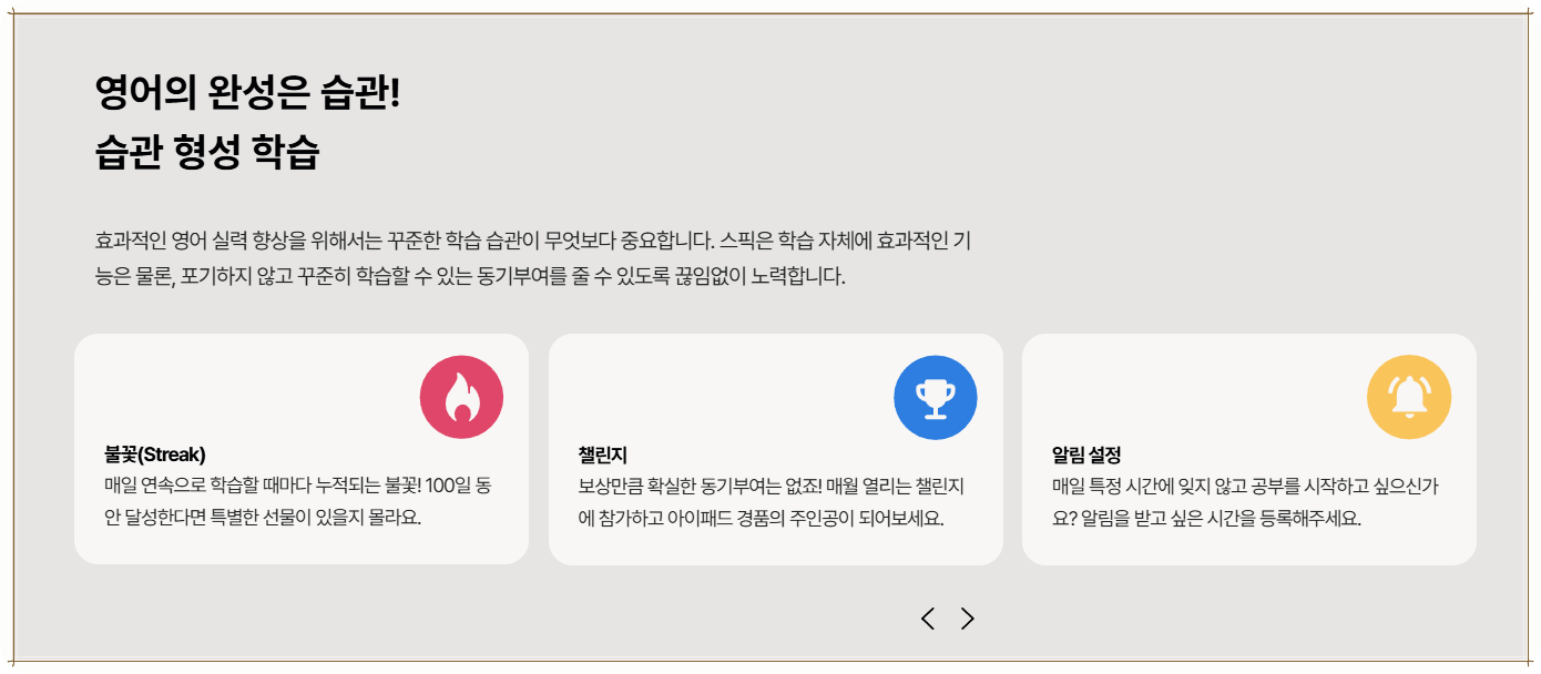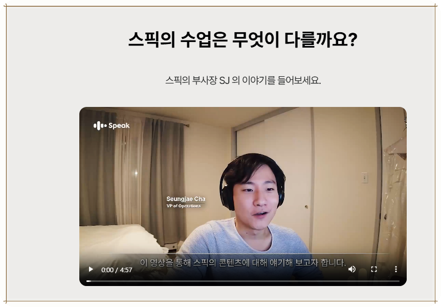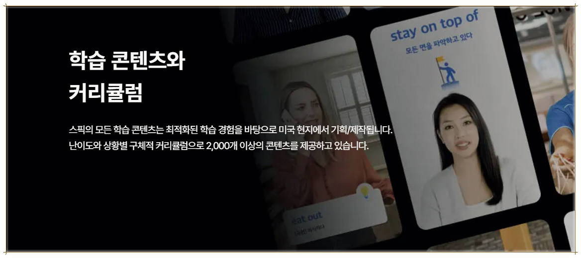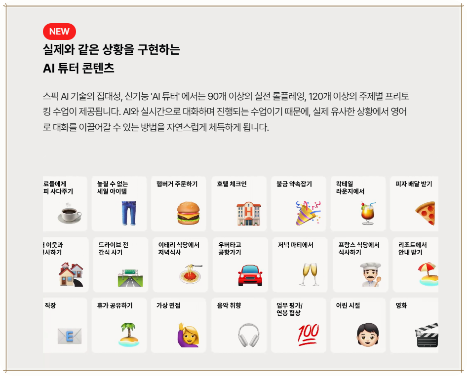 또한 시중에 유사한 인강들이 많지만, 스픽의 AI는 지속적으로 사용자 성향에 맞는 스피킹 연습을 끌어내 줘서 매우 효과적이었습니다. 지원 시스템 덕분에 스스로가 영어 공부를 하고 있다는 느낌을 받아 더욱 동기부여가 되었습니다.