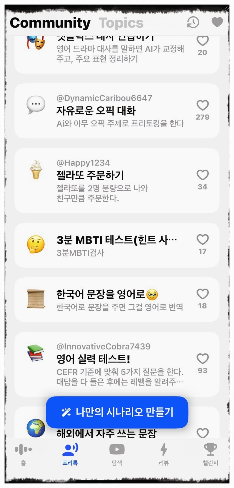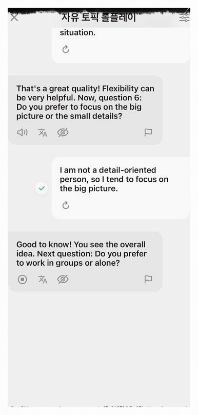 튜터와의 대화는 문자로 가능하며, 올바른 문법이나 발음 교정 외에도 자연스러운 표현을 제안합니다. 또한, 스픽은 다양한 챌린지를 통해 학습의 흥미를 유도하고, 롤플레잉 방식으로 실전 능력을 기를 수 있는 시나리오를 연출해줍니다. 이는 실제 생생한 대화 연습을 통해 영어에 대한 자신감을 키우는 데 도와줍니다.