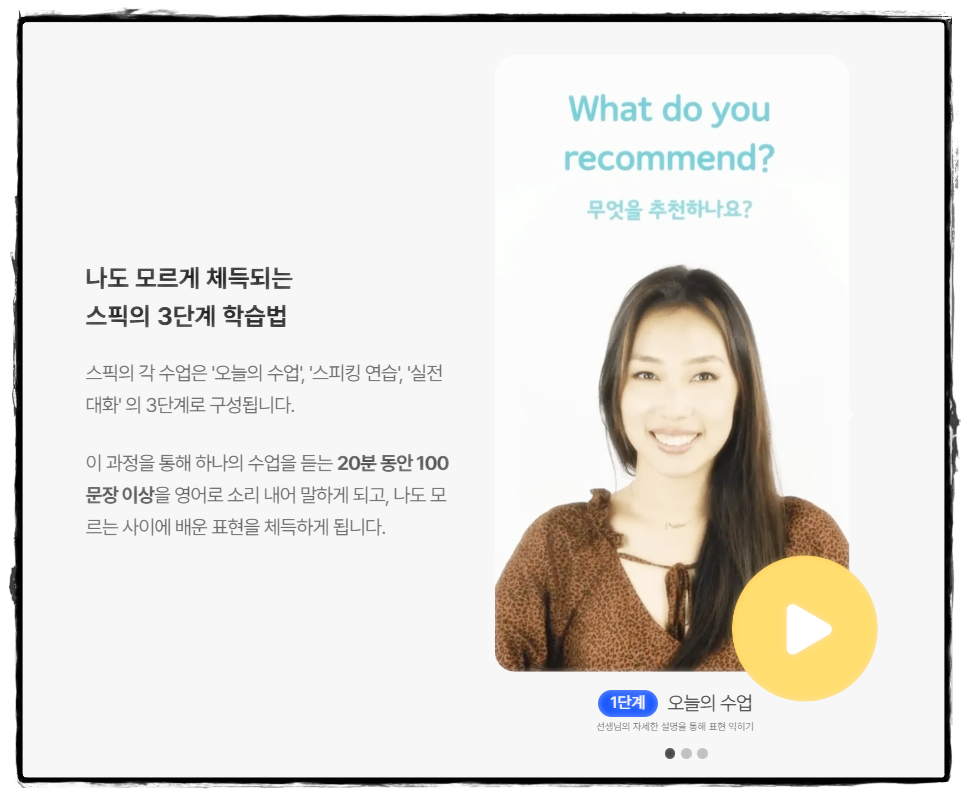 그래서 저는 스픽이라는 어플을 통해 매일 스피킹 연습을 하고, 5분짜리 기초 영어회화 리스닝을 통해 듣기 연습을 병행했습니다. 또한, 밀리에서 영어 원서를 읽으며 리스닝과 해석을 반복하는 방식으로 공부하고 있습니다. 이렇게 다양한 자료를 활용하면서 공부하는 것이 중요하다는 것을 깨달았습니다.