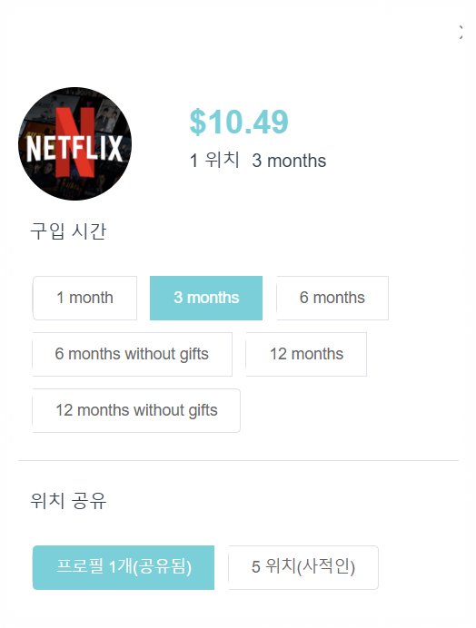 로그인 후, 초기 화면에서 원하는 서비스(예: YouTube Premium)를 선택합니다. 구독 기간은 6개월, 12개월, 24개월 중 선택할 수 있으며, 기간에 따라 추가 무료 이용 기간(+1개월, +2개월, +4개월)이 제공됩니다.