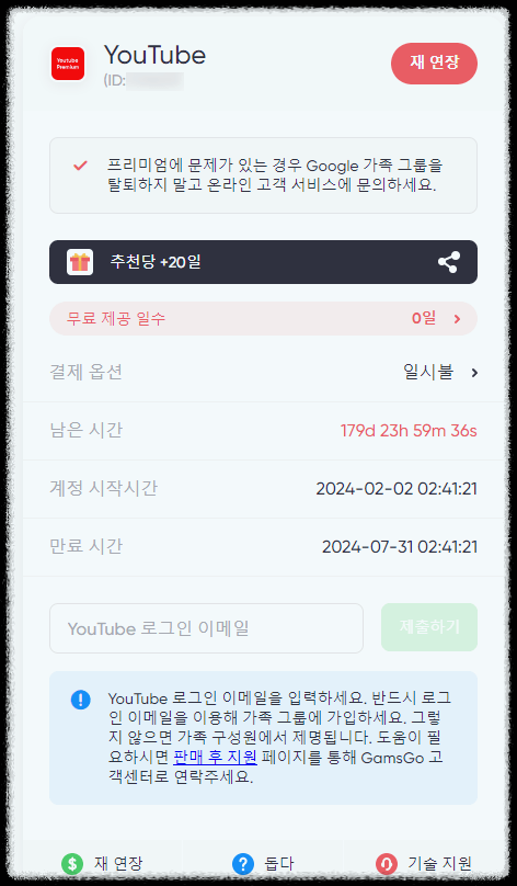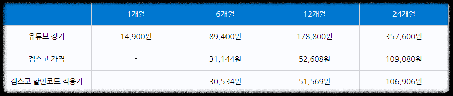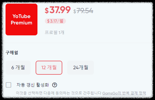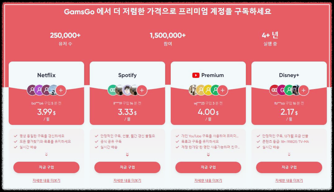 대신, VPN 우회 없이도 편리하게 이용할 수 있는 방법으로 겜스고를 추천합니다. 겜스고는 복잡한 VPN 설정 없이도 저렴한 가격에 유튜브 프리미엄을 이용할 수 있는 계정 공유 서비스입니다. 이를 통해 월 $3.40, 즉 한화로 약 4,800원에 유튜브 프리미엄을 즐길 수 있습니다.