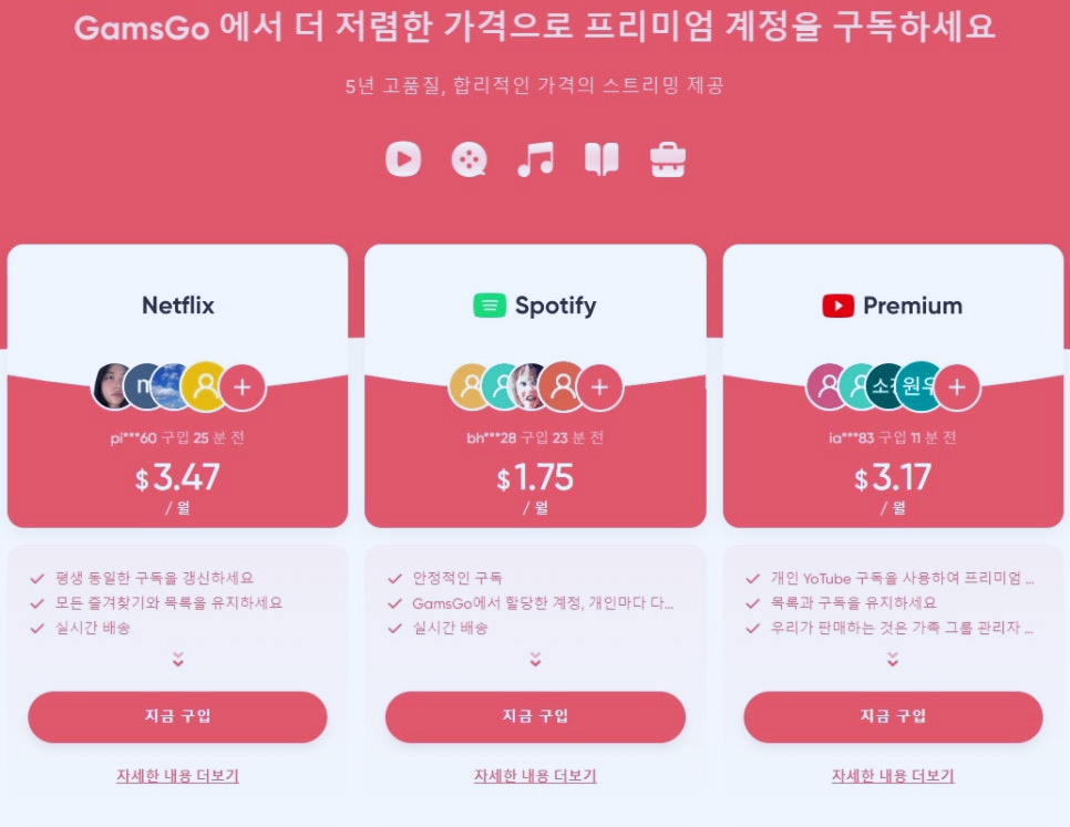 겜스고는 전 세계 다양한 OTT 서비스의 계정을 저렴하게 공유해주는 플랫폼입니다. 넷플릭스, 유튜브 프리미엄, 스포티파이 등 여러 인기 서비스들을 최대 70~80% 할인된 가격으로 이용할 수 있는 것이 큰 장점입니다. 이곳은 한국어 지원이 되어 있어 쉽게 접근할 수 있으며, 다양한 결제 방법이 제공되기 때문에 복잡한 절차 없이 간편하게 사용할 수 있습니다. 특히 디즈니플러스와 같은 인기 콘텐츠를 저렴하게 즐길 수 있다는 점에서 많은 사용자들에게 사랑받고 있습니다.
