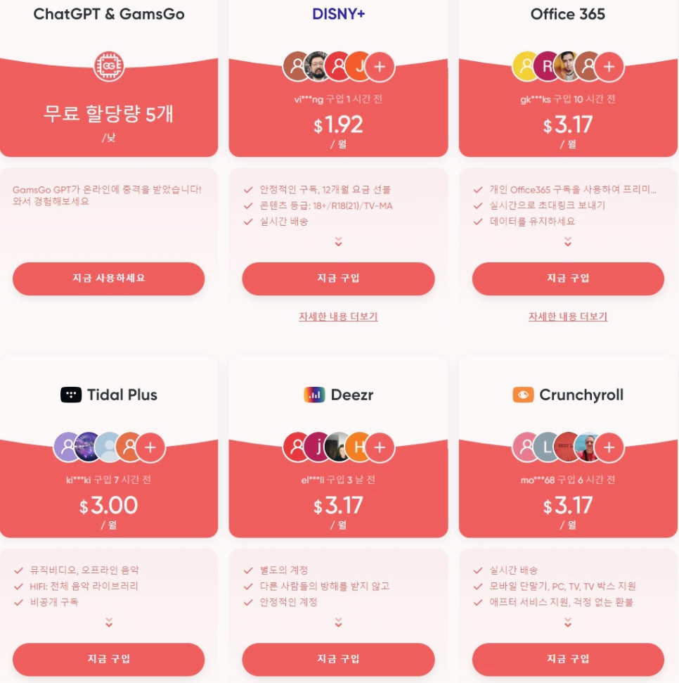 겜스고는 다양한 OTT 서비스와 프로그램 이용권을 저렴하게 구독할 수 있도록 도와주는 서비스입니다. Disney+뿐만 아니라 넷플릭스, 유튜브 프리미엄, 챗 GPT 4.0, Office 365, Deezr, Crunchyroll 등 다양한 플랫폼의 이용권을 약 70~80% 할인된 가격으로 제공하고 있습니다. 이용 방식은 간단합니다. 필요한 이용권을 구매한 후, 이메일로 전송된 계정 정보를 등록하면 바로 서비스를 이용할 수 있습니다.