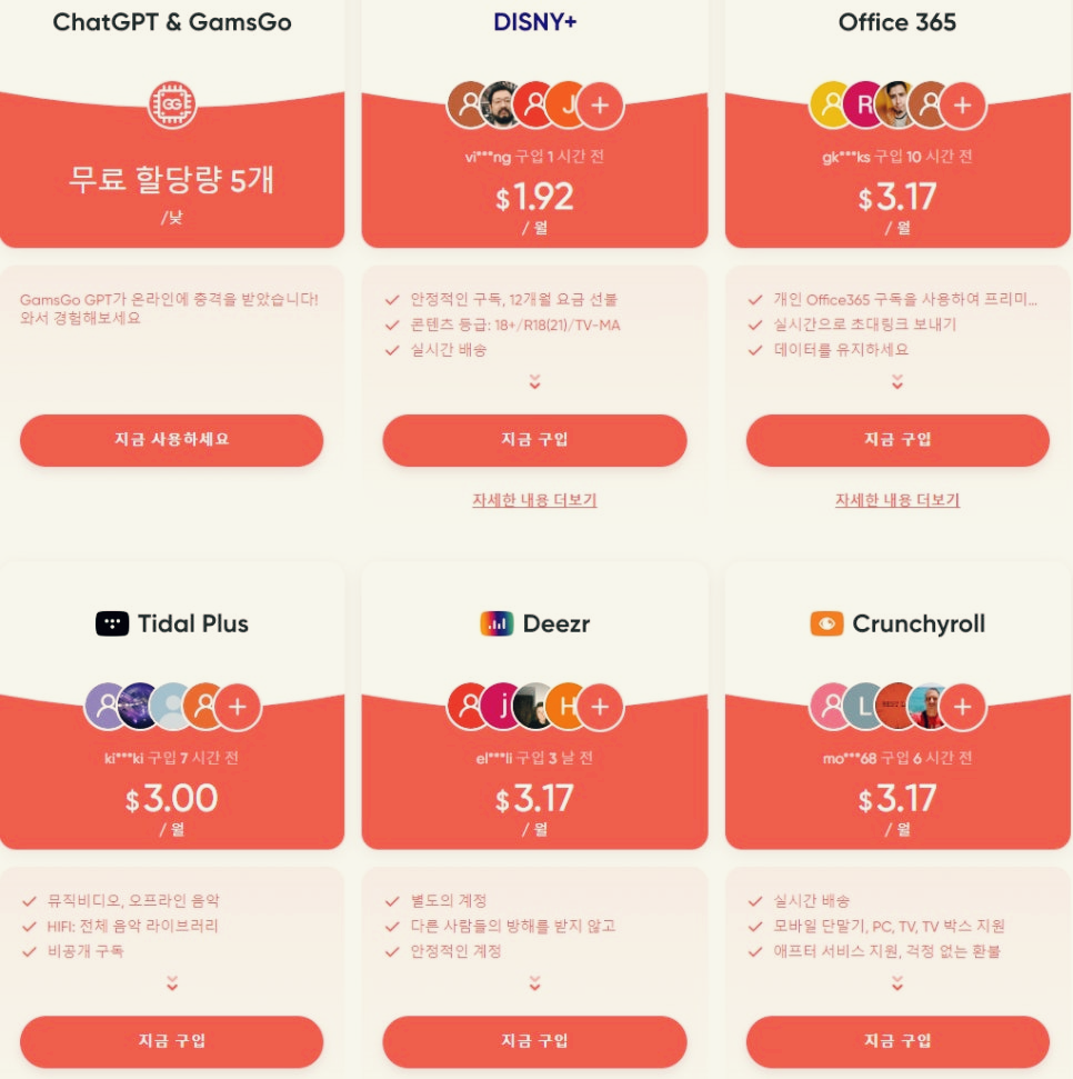 A: 겜스고(GamsGo)는 넷플릭스, 유튜브 프리미엄, 디즈니플러스 등 다양한 OTT 서비스와 여러 구독 서비스를 저렴한 가격에 제공하는 플랫폼입니다. 특히 디즈니플러스를 기존 가격보다 훨씬 저렴한 가격으로 이용할 수 있어 많은 사용자들이 이용하고 있습니다.