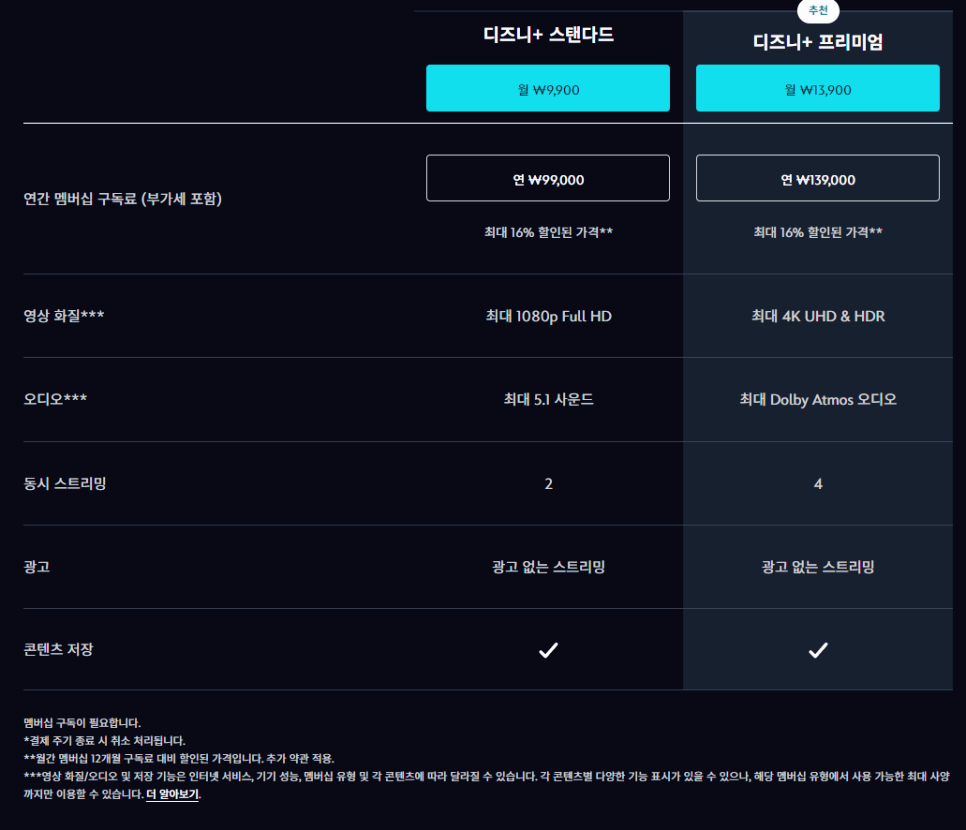 - 프리미엄 요금제: 4K UHD 및 HDR 화질을 제공하며, 최대 4명이 동시 스트리밍 가능합니다. 월 이용료는 13,900원, 연간 결제 시 139,000원입니다.