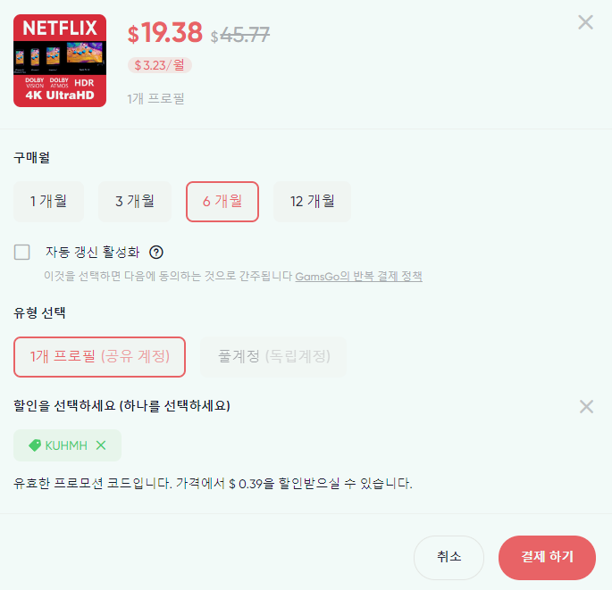 겜스고를 이용하면 넷플릭스의 프리미엄 요금제를 UHD(4K) 화질로 즐길 수 있고, 무엇보다 월 4,000원대로 이용할 수 있다는 점이 큰 장점입니다. 다만, 다른 사람과의 공유는 불가능하다는 점을 염두에 두셔야 합니다.