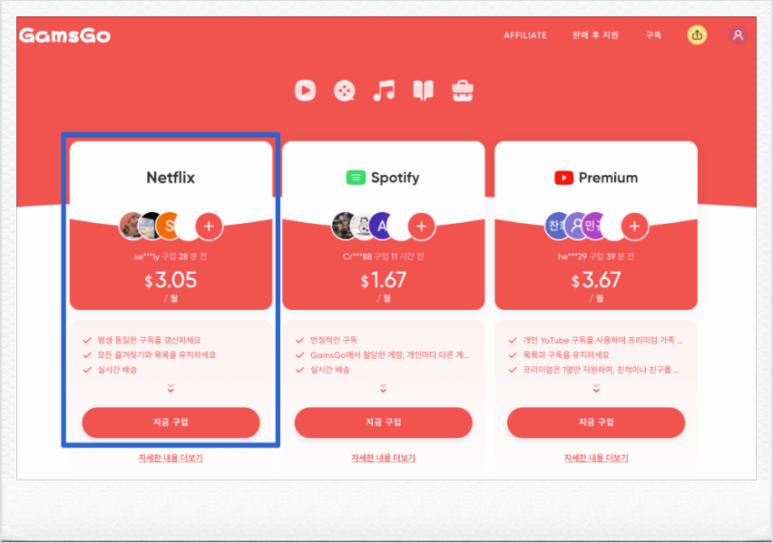 구매 시 할인코드 입력 항목이 있으며, [KUHMH]를 입력하면 넷플릭스와 유튜브는 5%, 그 외에는 3% 추가 할인을 받을 수 있습니다. 최대 7천5백 원대로 저렴해지니 꼭 입력해 보세요~
