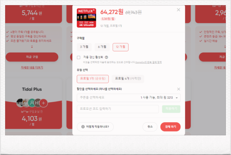 구매 시 할인코드 입력 항목이 있으며, [ KUHMH]를 입력하면 넷플릭스와 유튜브는 5%, 그 외에는 3% 추가 할인을 받을 수 있습니다. 최대 7천5백 원대로 저렴해지니 꼭 입력해 보세요~