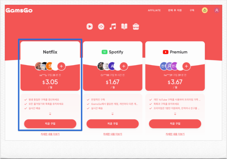 겜스고를 이용하면 챗지피티뿐만 아니라 넷플릭스, 유튜브 프리미엄 서비스도 저렴하게 이용할 수 있습니다. 할인된 가격으로 다양한 서비스를 이용하는 것은 개인의 경제적 부담을 줄이는 데 큰 도움이 됩니다. 따라서 챗지피티를 저렴하게 이용하고자 하는 사용자라면 겜스고를 적극 활용하는 것이 좋습니다.