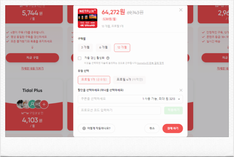 구매 시 할인코드 입력 항목이 있으며, [KUHMH]를 입력하면 넷플릭스와 유튜브는 5%, 그 외에는 3% 추가 할인을 받을 수 있습니다. 최대 7천5백 원대로 저렴해지니 꼭 입력해 보세요~