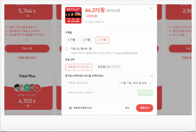구매 시 할인코드 입력 항목이 있으며, [KUHMH]를 입력하면 넷플릭스와 유튜브는 5%, 그 외에는 3% 추가 할인을 받을 수 있습니다. 최대 7천5백 원대로 저렴해지니 꼭 입력해 보세요~