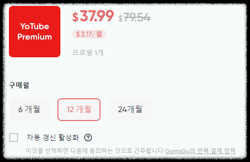 겜스고 사이트에서 넷플릭스 프리미엄 요금제를 선택할 때는 여러 개월 옵션 중에서 자신에게 맞는 것을 선택할 수 있습니다. 1개월, 3개월, 6개월, 12개월 중에서 선택할 수 있으며, 자동 갱신 여부도 설정할 수 있습니다. 이때 주의할 점은 자동 갱신을 비활성화할 경우 3개월, 6개월, 12개월 옵션만 선택할 수 있다는 것입니다.