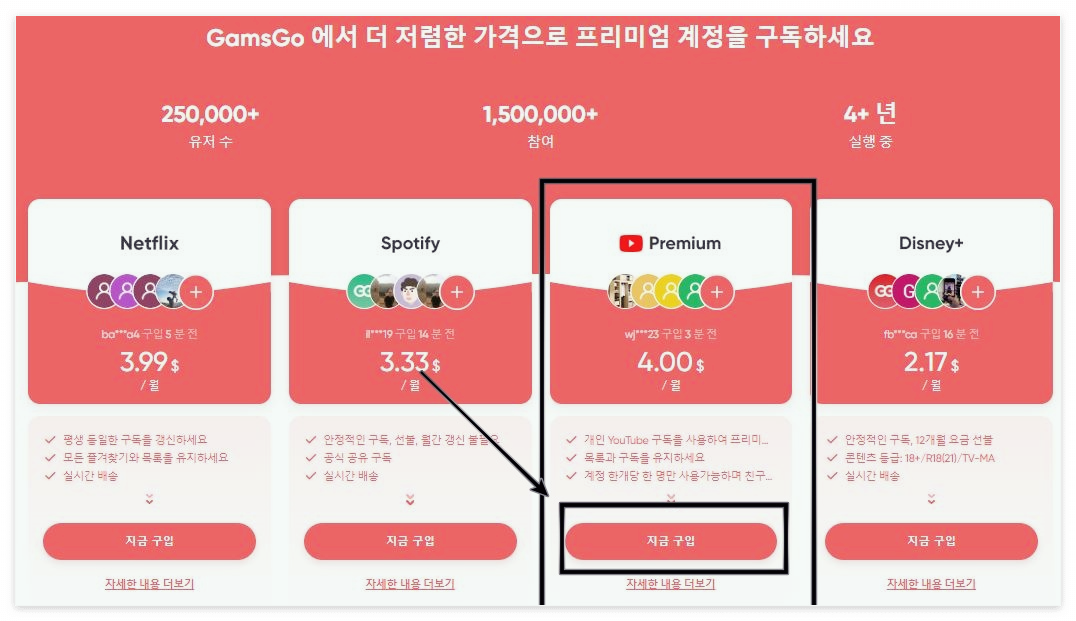 겜스고는 5년 이상 운영된 글로벌 OTT 계정 공유 플랫폼으로, 유튜브 프리미엄뿐만 아니라 다양한 서비스의 저렴한 구독 옵션을 제공합니다. 넷플릭스 프리미엄, 스포티파이, 어도비, 디즈니 플러스 등 여러 인기 콘텐츠를 저렴하게 이용할 수 있는 것이 큰 장점입니다. 현재 22만 명 이상의 사용자가 이 플랫폼을 통해 경제적으로 콘텐츠를 소비하고 있습니다.