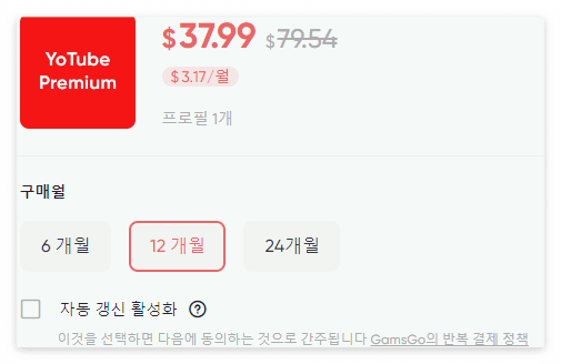 유튜브가족요금제 유튜브 프리미엄의 공식 가격은 월 14,900원으로, 연간으로 계산하면 178,000원이 됩니다. 이 금액도 결코 만만치 않죠. 하지만 겜스고를 통해 유튜브 프리미엄을 이용하면 월 3.17달러, 즉 약 4,251원으로 이용할 수 있습니다. 12개월치를 결제하면 총 37.99달러, 즉 50,948원이 되며, 이 역시 공식 가격에 비해 상당히 저렴합니다.